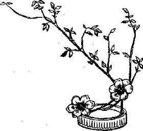 Ветки сосны, предварительно очищенные от лишних иголок, следует укрепить на наколке с левой и правой сторон икебаны, направив их верхушки друг к другу. Данная композиция, составленная на основе контрастного сочетания тонких веток сосны с ярко-зеленой хвоей и снежно-белыми соцветиями хризантем, создает необычайно яркую картину мартовского утра в сосновом бору. Икебана "Сосновый бор" является примером третьего варианта прямостоячей формы в низкой вазе.