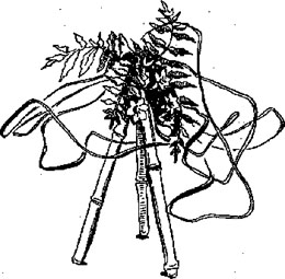 Скрепить концы бамбуковых стеблей в виде шалаша шпагатом и закрепить между ними сверху небольшой сосуд для воды. В сосуд поставить фреезию; и ветки папоротника. Дополнить аранжировку белой/ проволокой (рис. 131).