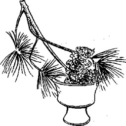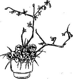 Установить наколку в вазе на второй позиции (рис. 24) и укрепить на ней гиацинты. С ветки сосны удалить иголки, оставив небольшие пучки только на концах. Укрепить перевернутую ветку на наколке, наклонив ее влево на 15° (рис. 132).