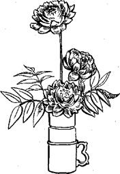 На вертикальном фиксаторе расположить пионы, наклонив их на 10° влево. После этого в вазе установить пушистые ветки скумпии: самую длинную - слева, наклонив ее под углом 45°, более короткую - справа, под углом 15°. Для того чтобы растения дольше хранились, нижние части их стеблей можно расщепить. Икебана построена по правилам третьего варианта наклонной формы в высокой вазе.