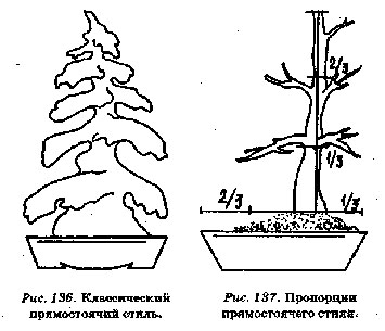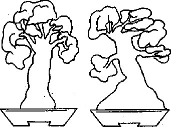 Ветви и листва дерева не должны быть слишком 'загущены. Свет и воздух должны свободно поступать к ним. Для выращивания растения в данном стиле лучше всего использовать контейнеры овальной, прямоугольной или квадратной формы (рис. 138 а, б).