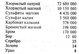 Кстати сказать, помимо золота в морской воде имеется и много других минералов. Вот таблица, в которой приводится количество минералов в тоннах на кубический километр морской воды:
