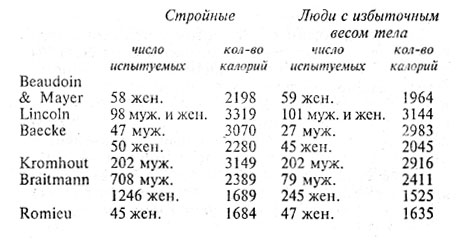 Многочисленные исследования убедительно показывают, что люди, которые много едят, как правило, люди худые. Так, например, английские подростки потребляют меньше, чем их родители - они недобирают в среднем 300-500 калорий по сравнению с нормами, рекомендуемыми Всемирной организацией здравоохранения, и все же большинство из них страдает избыточным весом. Еще одно исследование, проведенное в Шотландии, показало, что толстые девочки едят не больше худощавых. Наконец, была выполнена обширная работа, к которой были привлечены более 3000 взрослых англичан - девятьсот сотрудников фирмы "Бичем Фудс", тысяча работников городского управления Лондона и полторы тысячи других государственных служащих. Итог - "поразительное отсутствие соответствия между потреблением калорий и весом тела, независимо от пола и вида деятельности".