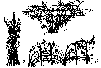 | Способы подвязки малины: а - веерная; б - шпалерная; в - подвязка к колу |