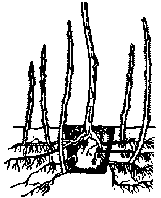 8 - 12 побегов замещения высотой около 2 м, из которых оставляют семь лучших, подвязывают их к проволоке и укорачивают на высоте 150 см. Необходимо следить за тем, чтобы в ряду кусты малины занимали узкую полосу шириной 30 см. Поросль и сорняки удаляют на всей площади посадок, что является одним из главных условий получения высокого урожая малины. В отличие от других ягодников, особенно в первые годы жизни, на участке посадок малины образуются порослевые побеги, которые нужно всегда своевременно удалять. В начале лета при отрастании зеленых побегов на высоту 10 - 15 см острой лопатой подрезают их в земле на глубине 7 - 10 см. Второй раз поросль удаляют через три недели, причем зеленую поросль удаляют ежегодно.