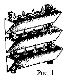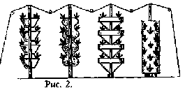 Конические односторонние емкости устанавливают на вертикальных плоскостях - солнечных сторонах стен домов, заборов, балконов. Емкости изготавливаются из досок или кровельного железа, и подвешиваются за ушки на вертикальные опорные рейки. Их можно размещать на рейках со смещением в ту или иную сторону, что создаст определенный коративный эффект, (см. рис. 1.)