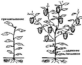 Для образования компактного куста с хорошо развитыми боковыми побегами необходимо удалить верхушку главного стебля, когда растение перца достигнет высоты 20 - 25 см. Прищипнутые растения быстро начнут ветвиться. Из всех появившихся побегов оставляют только 4 - 5 верхних (пасынков), а остальные удаляют. На оставленных побегах будет формироваться урожай. При этом на растениях перца оставляют 10 -14 плодов. (Кстати подобным образом формируются и растения баклажанов, только плодов на них надо оставлять 6-8).