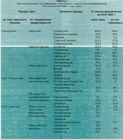В России разводят более 30 пород овец, что обусловлено большим разнообразием природных и экономических условий страны. Овцы разных пород в той или иной степени различаются между собой по продуктивно-биологическим качествам. С учетом этих особенностей принята следующая производственная классификация овец (табл. I)