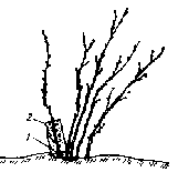 При формировании куста красной смородины обычно рекомендуют срезать нулевой побег на 1/3 высоты. Тогда на следующий год можно получить 2 - 5 побегов. Но срезая нулевой побег на указанную выше высоту, мы одновременно уничтожаем верхушечные почки смородины - наиболее сильные и урожайные. Поэтому я в период набухания почек удаляю лишь одну верхнюю почку, а плодовые почки вокруг нее оставляю. На следующий год и в этом случае точно так же отрастают 2 - 5 новых побегов на нулевом стволе. Зато верхушечный урожай сохраняется и формировка куста не нарушается.