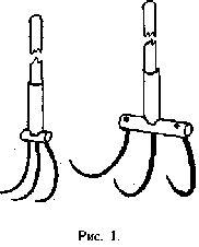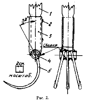 Некоторые советы по изготовлению рыхлителя: длина заточки зубьев 5 30 - 40 мм; вначале на поперечине 4 должны быть закреплены зубья 5 в прямом их состоянии, а затем державка 3; черенок крепится с державкой 3 шурупами 2 диаметром 4 - 5 мм; изгиб зубьев производится после полной сборки рыхлителя с помощью отрезка трубы длиной 500 - 600 мм, которая надевается на изгибаемый зуб и используется как рычаг для облегчения гибки; по мере гибки зуба трубу можно постепенно перемещать от корня зуба к его концу.