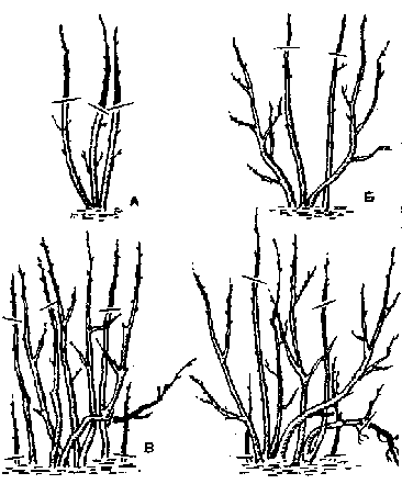 Для замены вырезанных ветвей ежегодно оставляйте по четыре-пять самых сильных однолетние прикорневых побегов, равномерно расположенные в кусте. Бывает, что старая ветвь удачно расположена в кусте и имеет сильные боковые приросты хорошо развитыми почками, а молодая, наоборот, слабо развита и затенена. В таких случаях вырезайте слабую молодую ветвь до основания, а старую, но хорошо развитую, обрежьте до сильного бокового разветвления, удалив лишь концы с ослабевшим приростом.