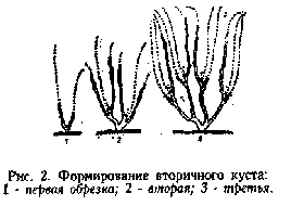Обрезка молодых кустов для образования веерной бесштамбовой формы куста производится следующим образом (рис. 2).