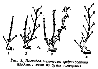 Плодовое звено является основным элементом обрезки винограда. Принцип строения плодового звена прост. На конце рукава выбирают два ближайших к старой древесине побега. Вертикально стоящий стебель (побег) обрезают, оставив на нем 6 почек, а второй, что отходит снизу, обрезают на 2 почки. Эти два побега (длинный и короткий) называют плодовым звеном. Длинный побег называют побегом плодоношения (на нем развиваются 6 побегов с урожаем), а короткий - сучком замещения. При обрезке в следующем году никаких трудностей уже нет. Достаточно полностью вырезать весь разветвленный побег плодоношения, а из двух побегов сучка замещения сформировать плодовое звено (рис. 3).