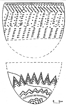 Наиболее крупный сосуд орнаментирован в верхней части сдвоенными отпечатками нити - "веревочки", по выделенному плечику нанесен ряд строенных отпечатков гребенчатого штампа.