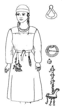 По вещам могильники датируются концом XII-XIII веками. Набор украшений, представленный в этом и других погребениях, Ц характеризуется наличием вещей финно-угорского происхождения и славянского. Так, родиной лунничных височных колец первоначально было Прикамье27, а косорешетчатые подвески, найденные в двух погребениях Марьинского могильника, считаются неотъемлемым украшением словен новгородских. Но в XII-XIII веках все эти вещи утрачивают этническую определенность и широко бытуют на различных территориях Древней Руси. Шумящие подвески являлись излюбленным украшением финно-угорских женщин. Подвески-коньки, найденные в могильниках, относятся к типам, изготавливавшимся новгородскими ремесленниками29.