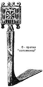 Прялки "соломенки" - корневые, лопасть меньше, чем у прялок Толшмы, заканчивается двумя парами городков в виде рожек, обращенных друг к другу, по нижнему краю лопасти круглые, прямо свисающие сережки. Ножка прялки высокая, стройная, слегка суженная кверху, после небольшого выступа заканчивается узким перехватом. В украшении прялок - столь непривычное для нас использование соломки. В центре лопасти - розетка, на остальной части лопасти и ножке также узор, выложенный соломкой, представляет собой зигзагообразную или елочкой композицию. В инкрустации использована соломка зеленого, малинового, а также естественного цветов.