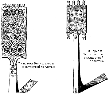 Прялки Великодворья с квадратной лопастью - тоже корневые, лопасть венчают редко расположенные четыре или пять ромбических городков, между которыми глубокие круглые вырезы, сережки повторяют форму городков, ножка прялки высокая, тонкая, суженная кверху. Узор на лопасти состоит из разных розеток, полурозеток, сегментов. Иногда по резьбе лопасть прялки раскрашена.