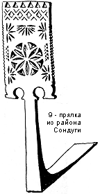 Прялки Сондуги - корневые. Лопасть вытянутая, больше, чем у прялок Тотьмы, но меньше, чем у тарногских прялок, треугольная форма городков напоминает городки прялок Великодворья с вытянутой лопастью, под городками ряд из квадратов, пересеченных крестом. Сережки закругленные, массивные, напоминают головы стилизованных коньков, обращены к ножке, постепенно зауженной кверху и заканчивающейся двумя выступами в виде зубцов. В центре лопасти - в круге - восьмилепестковая розетка, в углах - сегменты розеток. Иногда по резьбе лопасть прялки окрашена в бордовый или зеленый цвет.