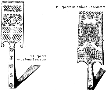 Прялки Заозерья. В данный раздел мы относим прялки со сквозной резьбой, сделанные мастерами Заозерского и Середского сельсоветов, так самостоятельная разновидность прялки Заозерья выделяются впервые. В фондах музея 11 заозерских прялок, из них три датированы 1880, 1906, 1936 годами. Первое их поступление в музеи было в 1930 году, последнее - в 1987 году.