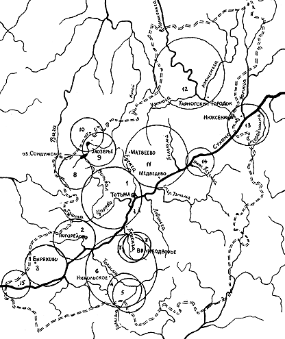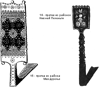 9 - прялки Заозерья; 10 - прялки Середского; 11 - прялки Матвеева и Медведева; 12 - прялки Тарноги; 13 - прялки Нюксеницы; 14 - прялки Нижней Печеньги; 15 - прялки Междуречья |