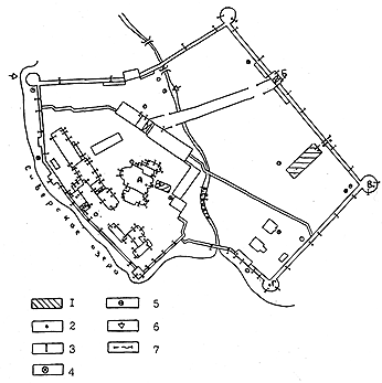 1 - пучиномерные площадки 1, 2; 2 - мерэлотомеры; 3 - стенные марки; 4 - глубинные репера; 5 - гидрорежимные скважины: 6 - гидрологические водопосты; 7 - профиль через крепостную стену.