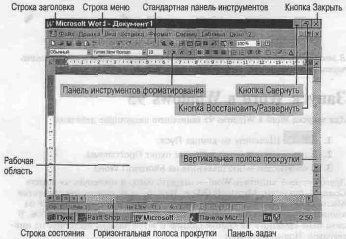 Кнопка минимизации Щелкайте на этой кнопке, чтобы временно свернуть окно Word. Затем щелкните на кнопке Microsoft Word на панели задач внизу экрана, чтобы восстановить окно Word