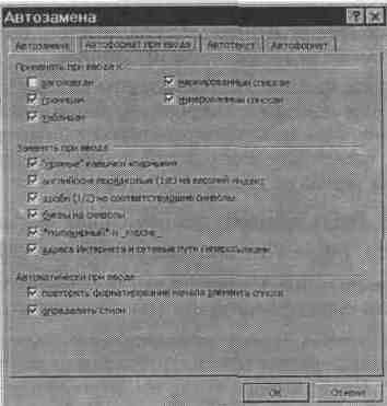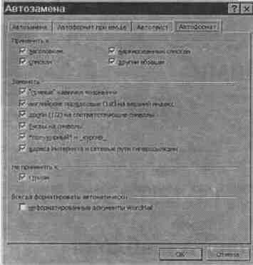 Изменение параметров в этом диалоговом окне Автозамена не приведет к изменению уже отформатированного текста. Оно повлияет только на тот текст, который вы наберете после установки и/или снятия флажков.