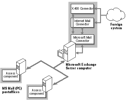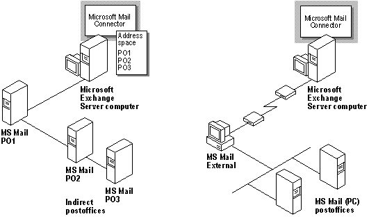 На сервере Exchange может быть установлен только один коннектор MS Mail и несколько MTA. В составе площадки несколько серверов Exchange могут иметь соединения с почтовым пространством MS Mail для балансировки нагрузки. Несколько агентов передачи сообщений могут обращаться к одному почтовому отделению.