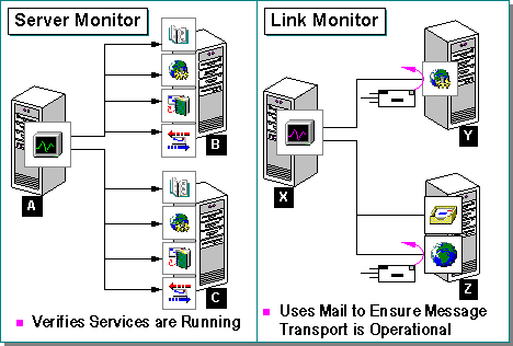 Мониторы соединений (Link Monitors). В их обязанности входит регулярная отправка и прием контрольных почтовых сообщений (ping messages) внешним площадкам и контроль времени прохождения этих сообщений в оба конца (round trip time). Мониторы соединений могут использоваться для проверки времени прохождения сообщений как между серверами внутри организации, так и между текущей площадкой и почтовыми системами внешних организаций, в том числе использующих другие почтовые системы. В последнем случае контрольное сообщение отправляется заведомо несуществующему адресату и оценивается время получения ответа о невозможности доставки (None Delivery Report или NDR). Каждый монитор соединения может обслуживать несколько серверов организации или внешних почтовых систем. Администратор назначает пороговые значения для перехода монитора в состояние повышенного внимания (warning state) и состояния тревоги (alert state). Для каждого из пороговых значений может быть задан список выполняемых действий: