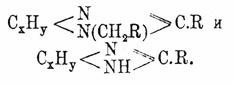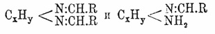 Одноатомные жирные альдегиды — ацетальдегид, изобутиловый альд., пропиловый альд., паранитрозобензальдегид, виноградный сахар, энантол — реагируют также с ароматическими диаминами (m-p- толуилендиамин, диамидотолуол, ортофенилендиамин). Свойства. этих А. отвечают формуле Гинзберга. Пара- и метадиамины, хотя и дают с ароматическими альдегидами соединения, но кислоты легко разлагают полученные тела, лишенные основных свойств, на исходные вещества. При изучении реакции р-нитробензальдегида с о-фенилендиамином, Гинзберг получил и упомянутые выше промежуточные соединения. Последние малостойки по отношению к кислотам и вступают в реакцию с хлорангидридом бензолсульфоновой кислоты и бензойным альдегидом, что доказывает присутствие в их формуле свободных аминогрупп. Из этих соединений авторы разными способами получили А. с приведенной выше формулой ангидрооснований. По свойствам А. во многом подобны глиоксалинам (см.) и представляют кристаллич. тела с пост. темп. пл. (ср. Фениленамидины и Пирроазолы).