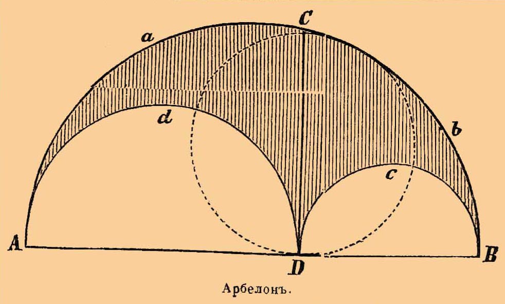 - Легко доказать, что площадь арбелона равна площади круга, имеющего диаметром перпендикуляр DC, восстановленный из точки касания D двух малых кругов и продолженный до пересечения с большим кругом.