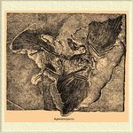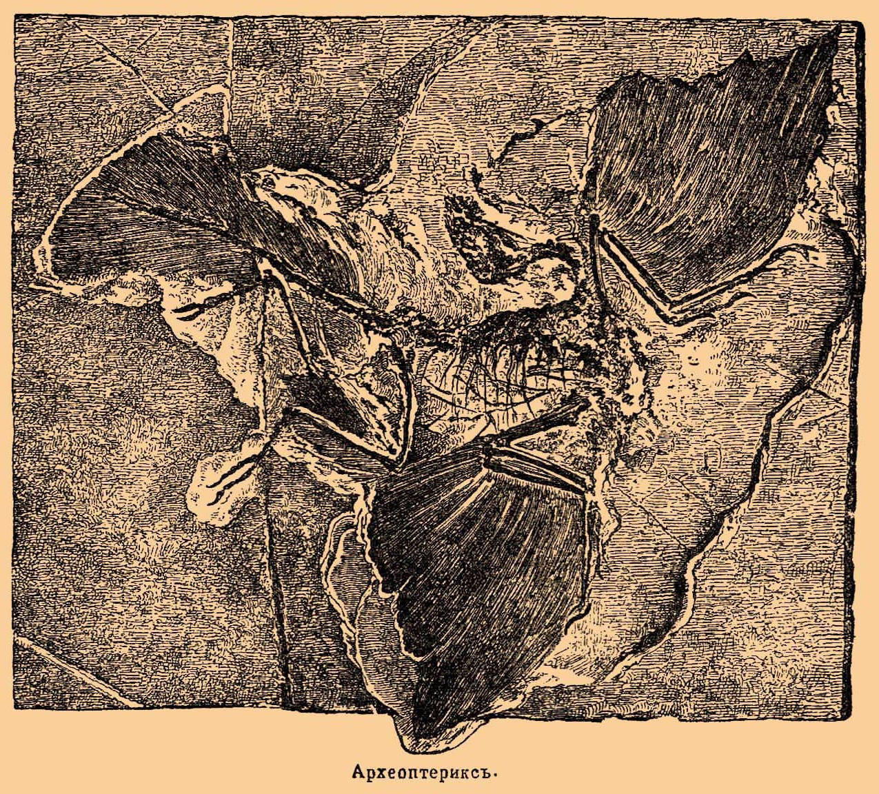 (Archaeopteryx) - в высшей степени замечательное ископаемое позвоночное животное величиною с голубя, занимающее промежуточное положение между пресмыкающимися и птицами. По строению таза и ребер, по двояковогнутым позвонкам, челюстям, покрытым зубами, и по длинному хвосту, состоящему из 20 позвонков, этот вид тесно примыкает к пресмыкающимся. Но конечности и череп построены по типу птиц; передние конечности были снабжены сильными маховыми перьями, хвостовые позвонки также были снабжены попарно сидевшими на них перьями; наконец, все тело археоптерикса было покрыто перьями. А. был, вероятно, лазящим животным, употреблявшим свои крылья скорее в виде парашюта, чем для летания. До сих пор известно лишь два хорошо сохраненных экземпляра археоптерикса, оба из верхнеюрского золенгофенского сланца. Первый, без головы, был найден в 1861 г. и хранится в Лондоне в Британском музее; второй, с головой, подтвердившей реставрацию головы, сделанную Овеном (Owe n) по первому экземпляру, найден в 1877 г. и находится теперь в палеонтологическом музее Берлинского университета.