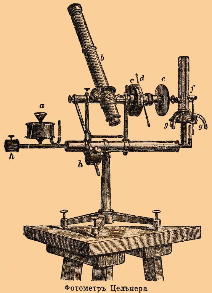 На стативе находится подвижная ось i, на которой укреплена горизонтальная ось с сосудом а для керосина. Сосуд этот соединен трубкою с лампой, к которой доступ воздуха происходит через трубку g, b есть зрительная труба, уравновешенная противовесом h. Посредством трубки, перпендикулярной в этой зрительной трубе, и зеркального стекла от пламени лампы получается искусственная звезда, которую наблюдатель видит в поле зрения одновременно с естественною звездою, яркость коей он желает измерить. В трубе помещены две Николевы призмы, поляризующие свет искусственной звезды. Николи поворачиваются рычагом и дают возможность изменять произвольным образом свет искусственной звезды. Наблюдение производится следующим образом. Наведя зрительную трубу на измеряемую звезду, вращают николи, пока яркости естественной и искусственной звезды не сделаются равными между собою. По градуированному кругу затем отсчитывают угол вращения николей, из которого можно по известной формуле теории света вычислить яркость наблюдаемой звезды. Так как естественные звезды бывают часто окрашены различными цветами, то в фотометре Цельнера находится еще шлифованный перпендикулярно к оптической оси кусок горного хрусталя, вращением которого можно окрашивать свет искусственной звезды, проходящий через этот кристалл, и приравнять окраску его к окраске естественной звезды. Угол вращения кристалла горного хрусталя измеряется на круге е. Посредством этого инструмента Цельнер положил основание фотометрическому обозрению неба, а также измерил яркости и альбедо (см. это сл.) отдельных планет. Сравнивая яркость Солнца с яркостью Луны, Цельнер получил для отношения этих двух величин число 618000. Раньше Цельнера сперва Бугер измерял это отношение и получил для него величину 8000000 (в 1725 г.), Вульстен в 1799 г. 801072, а в новейшее время Бонд в Кембридже (в Соед. Шт.) 470980. Для внешних планет отношения яркости солнечного света к яркости планет получились у Цельнера следующие: