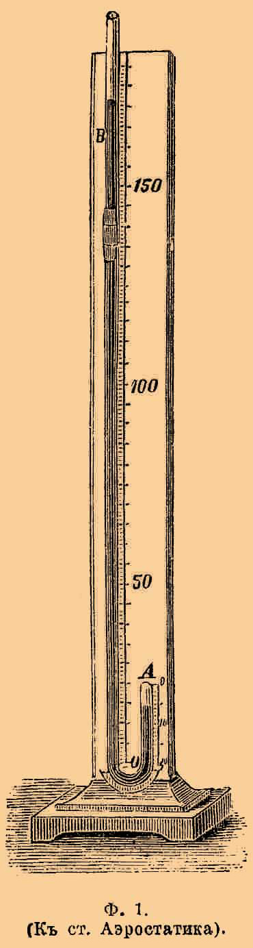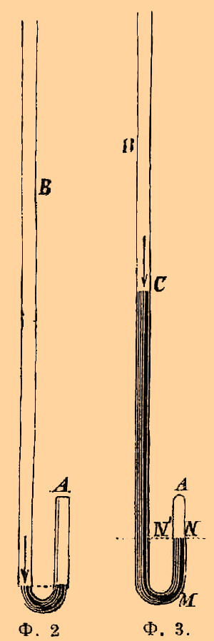 Существенной частью этого прибора является длинная, вверху открытая, внизу согнутая трубка, короткое колено которой запаяно. Сперва наливают в длинное колено столько ртути, чтобы она стояла в обоих коленах на одной высоте; воздух, запертый в коротком колене, находится, таким образом, под давлением одной наружной атмосферы.