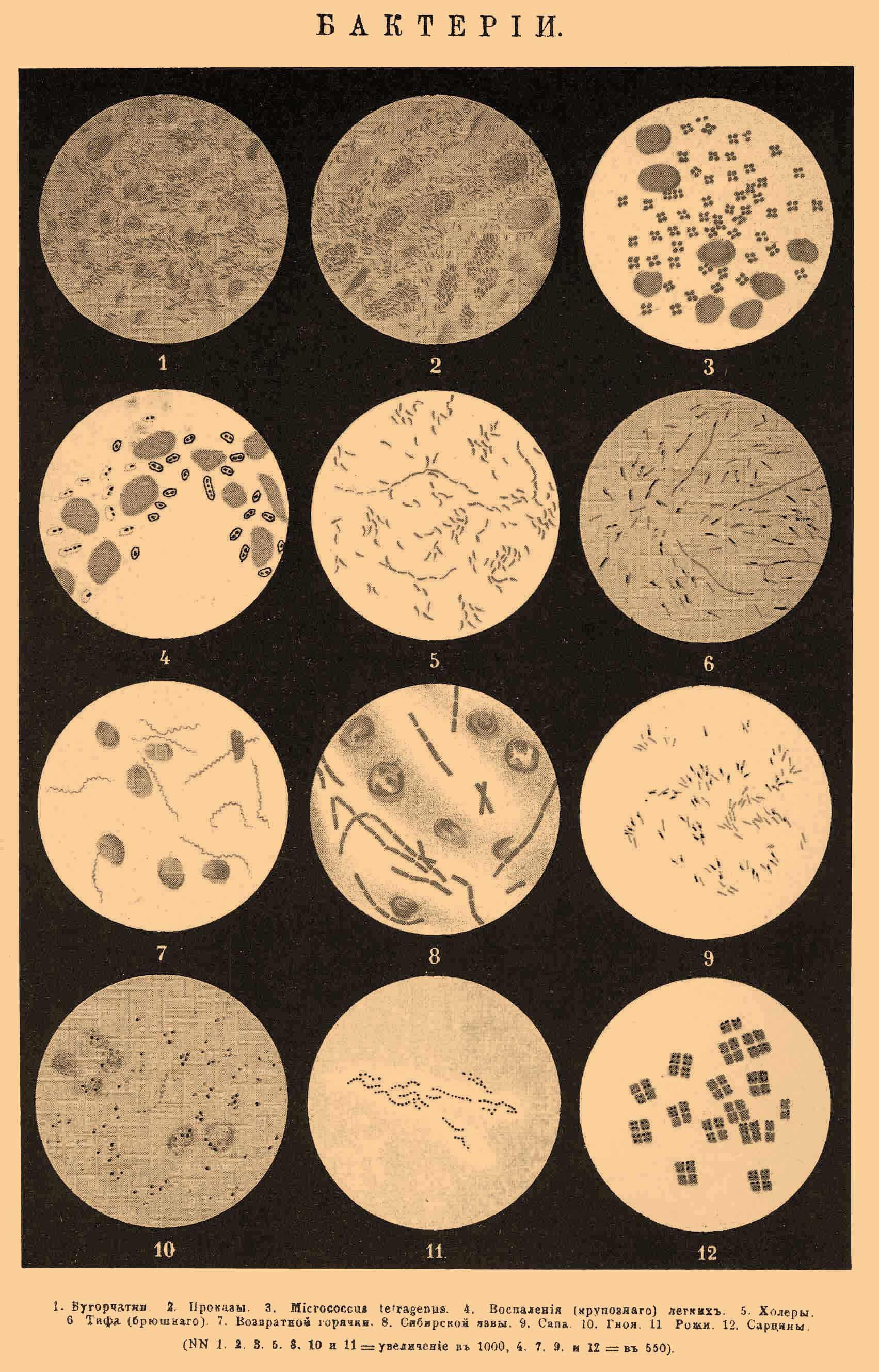 1. Бугорчатки. 2. Проказы. 3. Micrococcus tetragenus. 4. Воспаления (крупозного легких). 5. Холеры. 6. Тифа (брюшного). 7. Возвратной горячки. 8. Сибирской язвы. 9. Сапа. 10. Гной. 11. Рожи. 12. Сарцины.