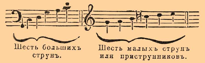 Он отвечает не лидийскому ладу, а древнегреческому. В музее С.-Петербургской консерватории находится Б., доставленная из Малороссии А. И. Рубцом, отличающаяся от описанной типической Б. тем, что у ней больших струн четыре, а приструнков 13. Строй больших струн: g, с, d, g, малых: d', е', f', g', a', b', с", d", e", f", g", a", b". Голосник состоит из 6 миндалевидных отверстий, соединяющихся в одном центре, а не из круглого отверстия.