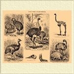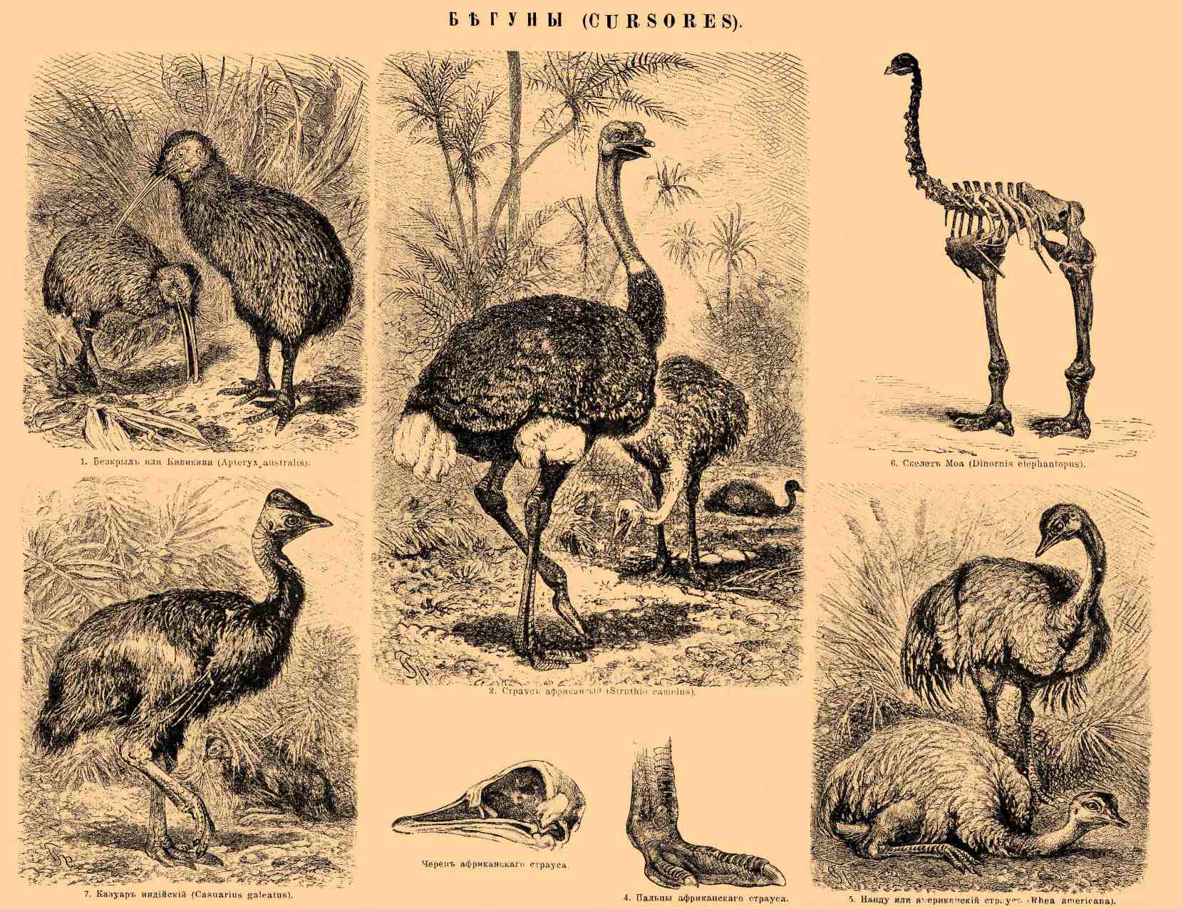 1. Бескрыл или киви-киви (Apteryx australis). 2. Страус африканский (Struthio camelus). 3. Череп африканского страуса. 4. Пальцы африканского страуса. 5. Нанду или американский страус (Rhea americana). 6. Скелет Моа (Dinornis elephantopus). 7. Казуар индийский (Casuarius galeatus).
