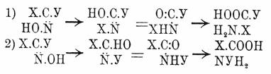на работу Штиглица ("Chem. Centr.", I, 1897), указавшего на аналогию Б. изомеризации с Гофмановским превращением амидов в замещенные амины под влиянием бромноватистой щелочи, и на заметку Валлаха ("L. A.", 1900), рекомендующего Б. изомеризацию как лабораторный способ получения первичных жирных аминов; для этого Валлах нагревает, напр., 10 г ацетоксима в большой колбе с 10 г кристаллической уксусной кислоты, прибавляет затем 20 куб. см крепкой серной кисл. и греет осторожно, малым пламенем; реакция окончена, как только смесь вскипела; жидкость пересыщают щелочью и отгоняют амин (в данном случае метиламин). Ввиду наблюдений Ганча, для получения чистого амина необходимо брать симметричный кетон общей формулы, Х.СО.Х. — Б. реакция установлена и для дикетонов; так, напр., Гюнтер ("L. А.", 1889) получил из α - бензилдиоксима C 6H5.C(NOH).C(NOH).C6H5 главным образом дибензенилазоксим Тимана —