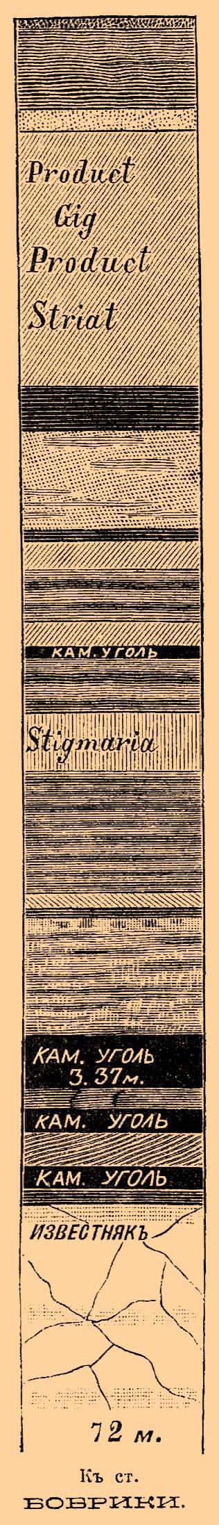 — селение Тульской губернии, Епифаньевского уезда, 54° сев. шир. и 8° вост. долг., при самых верховьях реки Дон; лежит от жел. дор. на Ряжск в 2 вер., среди возвышенной местности 785—793 фт. (112—113 саж.); от города Епифаньевска 20 вер.; жителей 2500. Свеклосахарный завод гр. Бобринского. Особенно замечательно это село в геологическом отношении. Здесь выходят как самые угленосные пласты каменноугольной системы, так и налегающие на них слои среднего яруса той же системы: а именно нижний и средний горизонт комплекса пластов, характеризующихся раковинами Productus Gigas и Prod. Striatus. Буровая скважина в Бобриках (см. табл.) после глин и песку прошла 15,6 метра желтого известняка с Prod. Gigas и Prod. Striat., затем после 16 метров различных слоев встречен каменный уголь в 0,5 метра; затем черные и серые глины на 23 метра и снова каменный уголь в 3,37 метра (4,75 арш.); снова серая глина в 1 метр и опять каменный уголь 1,55 метра, песок на 2 метра и каменный уголь на 1,74 метра. Вся глубина скважины в 71,5 метра.