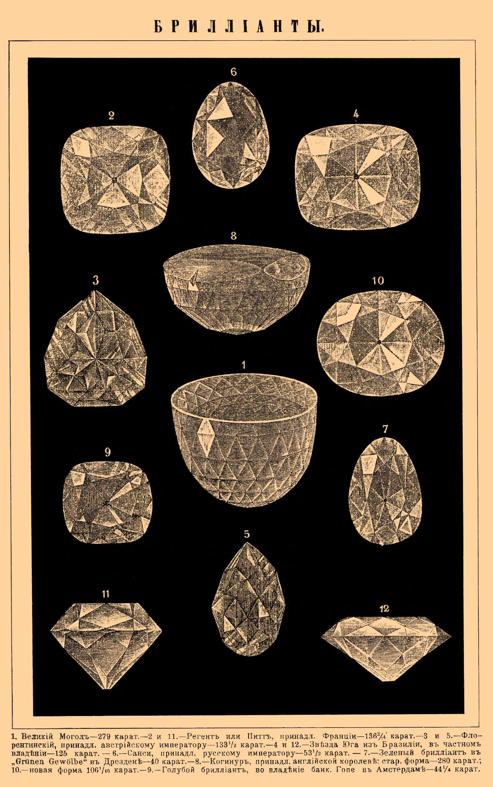 1. "Великий Могол" — 279 карат. — 2 и 11. "Регент" или "Питт", принадлежащий Франции — 136 ¾ карата. — 3 и 5. "Флорентийский", принадлежащий австрийскому императору — 133 ⅛ карата. — 4 и 12. "Звезда Юга" из Бразилии, в частном владении — 125 карат. — 6. "Санси", принадлежащий русскому императору — 53 ½ карата. — 7. "Зеленый Бриллиант" в "Gr ünen gewö lbe" в Дрездене — 40 карат. — 8. "Кохинур", принадлежащий английской королеве: стар. форма — 280 карат.; 10. новая форма 106 1/16 карата. — 9. "Голубой Бриллиант", во владении банкира Гопе в Амстердаме — 44 ¼ карата.