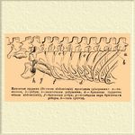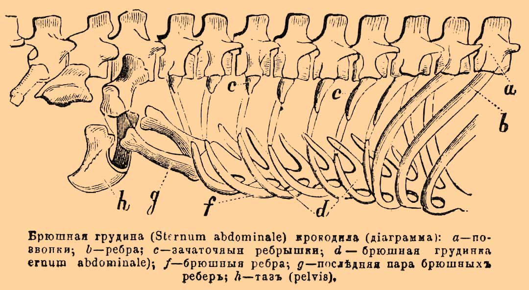 Брюшная грудина (Sternum abdominale) крокодила (диаграмма): а — позвонки; b — ребра; c — зачаточные ребрышки; d — брюшная грудинка (Sternum abdominale); f — брюшные ребра; g — последняя пара брюшных ребер; h — таз (pelvis).