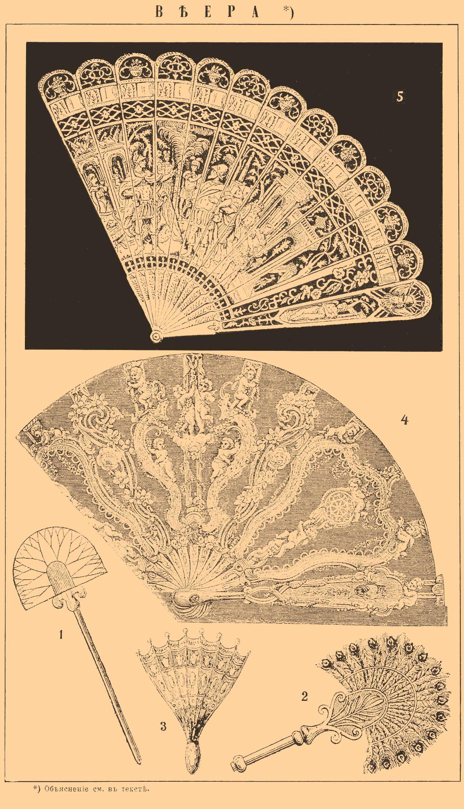 (от веять — дуть, обдавать потоком воздуха, обмахивать, опахивать воздухом; нем. — Fächer; франц. — éventail; англ. — fan). Родина В. — Восток, где, вместе с опахалом и зонтиком, он был одним из атрибутов царского достоинства, что подтверждают древние индусские поэмы ("Магабгарата" и "Рамаяна"). Сохранившиеся в разных музеях памятники искусства (миниатюры, барельефы и т. п.) дают возможность заключить, что первые В. делались из листьев банана, пальмы и лотоса. По-санскритски В. называется панк-ха , и изображения его можно часто видеть на индийских саркофагах. Его воспевают поэты, им раздувают священный огонь; Индра, бог неба, держит в руке В. из павлиньих перьев. В. из пальмового листа, называемый в Cиaмe maлапат, дал название всей касте жрецов, которые здесь зовутся талапоинами оттого, что держат постоянно в руках пальмовый лист. Богатые касты в Индии, для отличия от бедных, стали употреблять В. из павлиньих перьев "с глазами Аргуса", с резною ручкою. В Индии также встречается особый род гигантских В. — панк-хи — обтянутые муслином рамы, приводимые в движение панкхи-бердарем, специальным для того слугою. Эти веера-вентиляторы, если можно их так назвать, встречаются на Востоке в домах богатых англичан, у которых они приспособлены в каждой комнате над каждой головой; их же можно видеть на судах, в храмах, гостиницах и т. п.