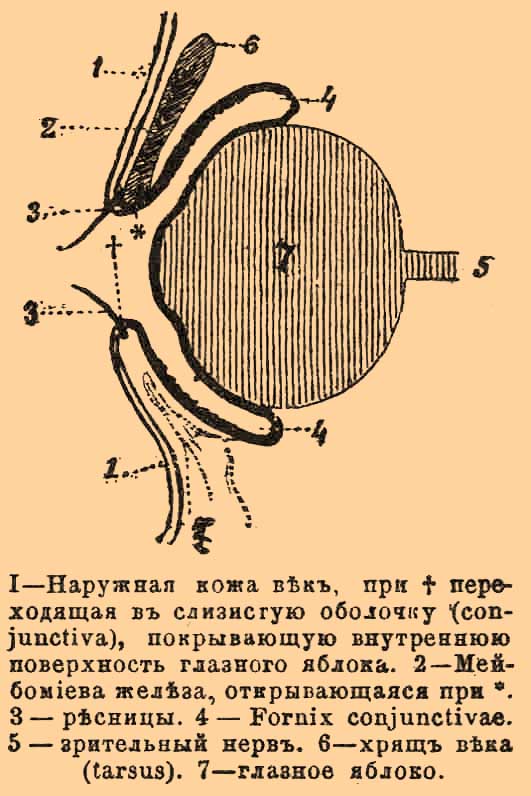 1 — Наружная кожа век, при † переходящая в слизистую оболочку (conjunctiva), покрывающую внутреннюю поверхность глазного яблока. 2 — Мейбомиева железа, открывающаяся при *. 3 — Ресницы. 4 — Fornix conjunctivae. 5 — Зрительный нерв. 6 — Хрящ века (tarsus). 7 — Глазное яблоко.