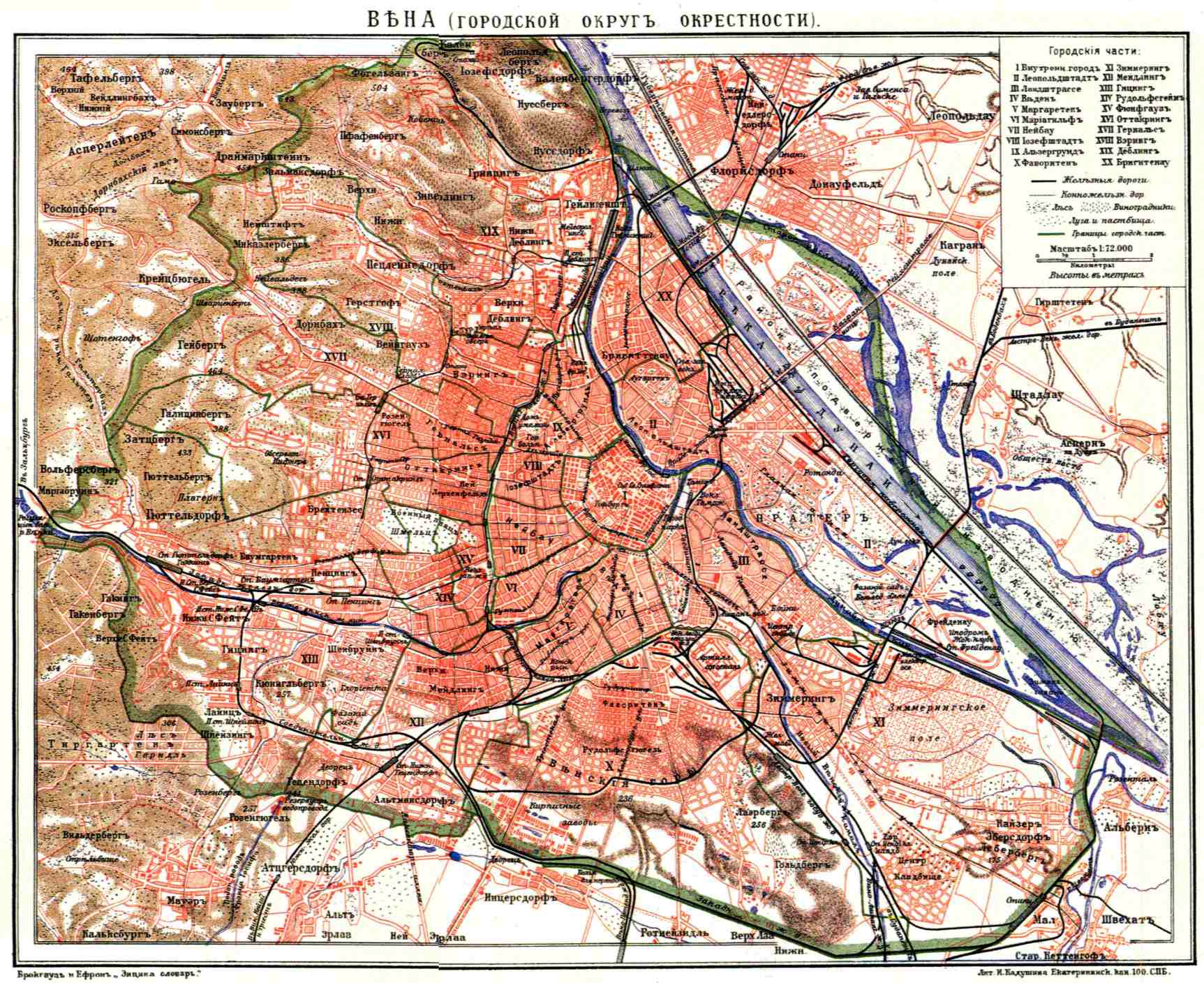 (Wien, по-франц. Vienne) — столица Австрии. В 1900 г. было 1687540 жителей, из них 26622 войска; на 100 муж. приходится 107 жен.; к 1904 г. по приблизительному подсчету считается 1798 тыс. жителей. Для внутреннего сообщения в В., кроме электрических трамваев и др., существует сеть городских жел. дорог на протяжении 42,5 км, из них 17 км поверх города, 21 км в выемках и 4,5 км — под землею (15 туннелей). Ежедневно ходит 176 поездов в каждом направлении; в 1902 г. провезено 33807873 пассажира. Бюджет города В. на 1900 г.: доходы и расходы — по 164663076 крон (около 66 млн. руб.). См. соотв. статью.