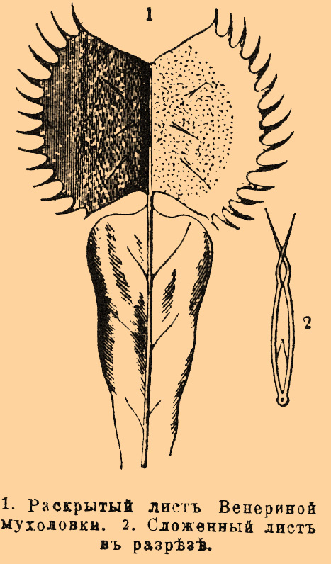 1. Раскрытый лист Венериной мухоловки. 2. Сложенный лист в разрезе.