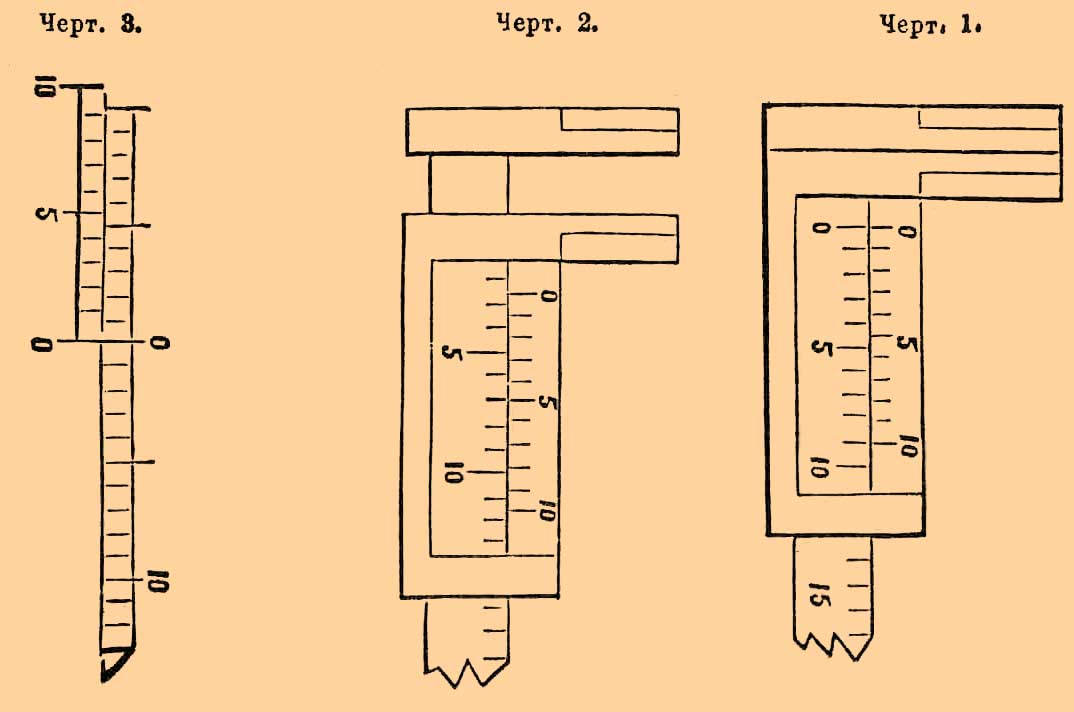 (Vernier, Nonius) — это приспособление употребляется в измерительных приборах, чтобы определить положение указателя между двумя чертами шкалы точнее, чем это можно сделать на глаз. Положим, например, что мы имеем раздвижной калибр или штангенциркуль с линейкой, разделенной на миллиметры. Нулевая черта на его подвижной части проводится обыкновенно так, чтобы она совпадала с нулевой чертой делений линейки, когда калибр сдвинут вполне (черт. 1).