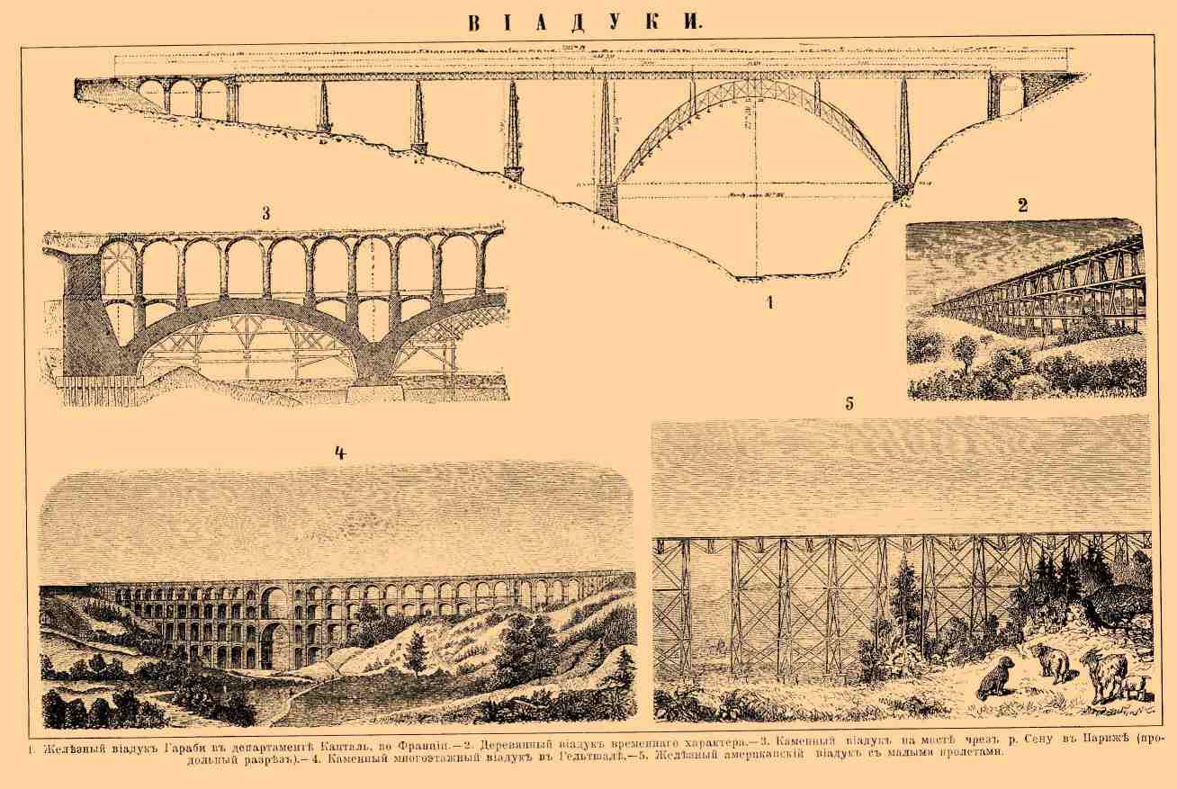 или путепроводы (франц. Viaduc, нем. Viaduct, англ. Viaduct). — Обыкновенно принято называть так значительных размеров мосты, устраиваемые через овраги или сухие долины или вообще там, где требуется провести шоссейную или железную дорогу выше поверхности земли. Постройка виадуков составляет очень важный отдел инженерного искусства, в особенности в странах с большими неровностями земной поверхности. В России, в Крыму, при постройке Лозово-Севастопольской железной дороги пришлось прибегнуть к их помощи; с постройкой же железных дорог на Кавказе для виадуков в России открылось обширное поле.