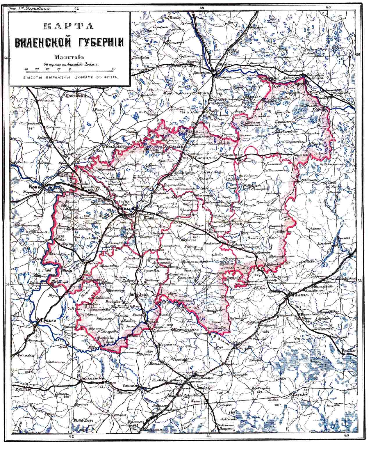 — граничит на С с губ. Ковенской, Курляндской и Витебской (от последней отделяется Западной Двиной), на В с губ. Витебской и Минской, на Ю с губ. Минской и Гродненской, на З с Гродненской губ. и Царством Польским (от которого отделяется Неманом). Расположена между 53°23' и 55°50' сев. шир. и между 24°54' и 29°20' восточной долготы (от Гринвича). Пространство губернии — 3890812 десятин (квадр. верст 37371,3). Самые значительные сплошные возвышенности губернии тянутся от окрестностей Вильны на юго-восток к Ошмянам и границе Минской губернии. Здесь значительные площади имеют высоты более 1 0 00 фут. над уровнем моря, как, напр., высоты при деревне Тупишки Ошмянского уезда и деревне Тарновцы Виленского уезда. Другая возвышенная площадь тянется от Вильны на ЮЮЗ, в Лидский уезд. Между ней и крайним северо-западным углом губернии находится более низменный участок, по Варшавской железной дороге, а за ним, в Трокском уезде — чрезвычайно пересеченная местность и вблизи города Новые Троки самая значительная высота губернии — 1127 ф. над уровнем моря; в Виленском же, постепенно понижаясь к р. Вилии, при впадении в нее р. Вилейки образует котловину, окаймленную со всех сторон, кроме северной, высотами, из коих к западу Панарские горы образуют цепь прорезанных оврагами холмов, покрытых лесом. Северный край этой цепи в 7 в. от впадения Вилейки упирается в р. Вилию и образует крутые, значительной высоты берега реки Вилии, замечательные своим разнообразием и красотой. С вост. стороны означенная котловина ограничена высокими песчаными холмами, из коих самые возвышенные горы: Трех-Крестовая, Замковая и Бекешевая около Вильно. Северная часть котловины с востока на запад прорезывается р. Вилией, правый берег которой близ Вильно имеет возвышенности, называемые Шемкине. На востоке губернии высоты, превышающие 900 футов над уровнем моря, находятся в уездах Вилейском и южной части Свенцянского, а самая низменная полоса губернии находится на северо-востоке, в Дисненском уезде, где большие пространства имеют высоту от 400 до 500 фут. Горные породы В. губ. принадлежат к нижнему ярусу третичной формации, кроме северной ее части, где показываются песчаники девонской формации. Нижний ярус эоценовой формации (т. е. третичной) состоит из сланцеватой глины, кремнистого песчаника, грубозернистого известняка, мергеля, меловида, рухляков и гипса. Все эти породы, расположенные неправильно перемежающимися пластами, перемешаны между собой. Морские осадки перемежаются с пресноводными. Коренные породы В. губернии обнажаются лишь в немногих местах, а по большей части скрыты полосами, частью водными (речными и озерными), частью ледниковыми. В. губерния несомненно была покрыта громадным ледниковым покровом, распространившимся из Скандинавии и Финляндии на равнины Европейской России; он оставил следы в больших залежах крупных и мелких валунов и ледниковой глины. Весьма вероятно, что следами его нужно считать и озерные котловины. Камни ледникового наноса принадлежат к кристаллическим породам: граниту, гнейсу, базальту, кварцу, трахиту и пр. и пригодны для разных построек. Из других минеральных богатств лигнит находится в имении Юнзилла Лидского у. В некоторых местах Трокского и Ошмянского уездов попадается луговой железняк, или болотистая руда с известняковым туфом, в глубине 1 фута под поверхностью. 