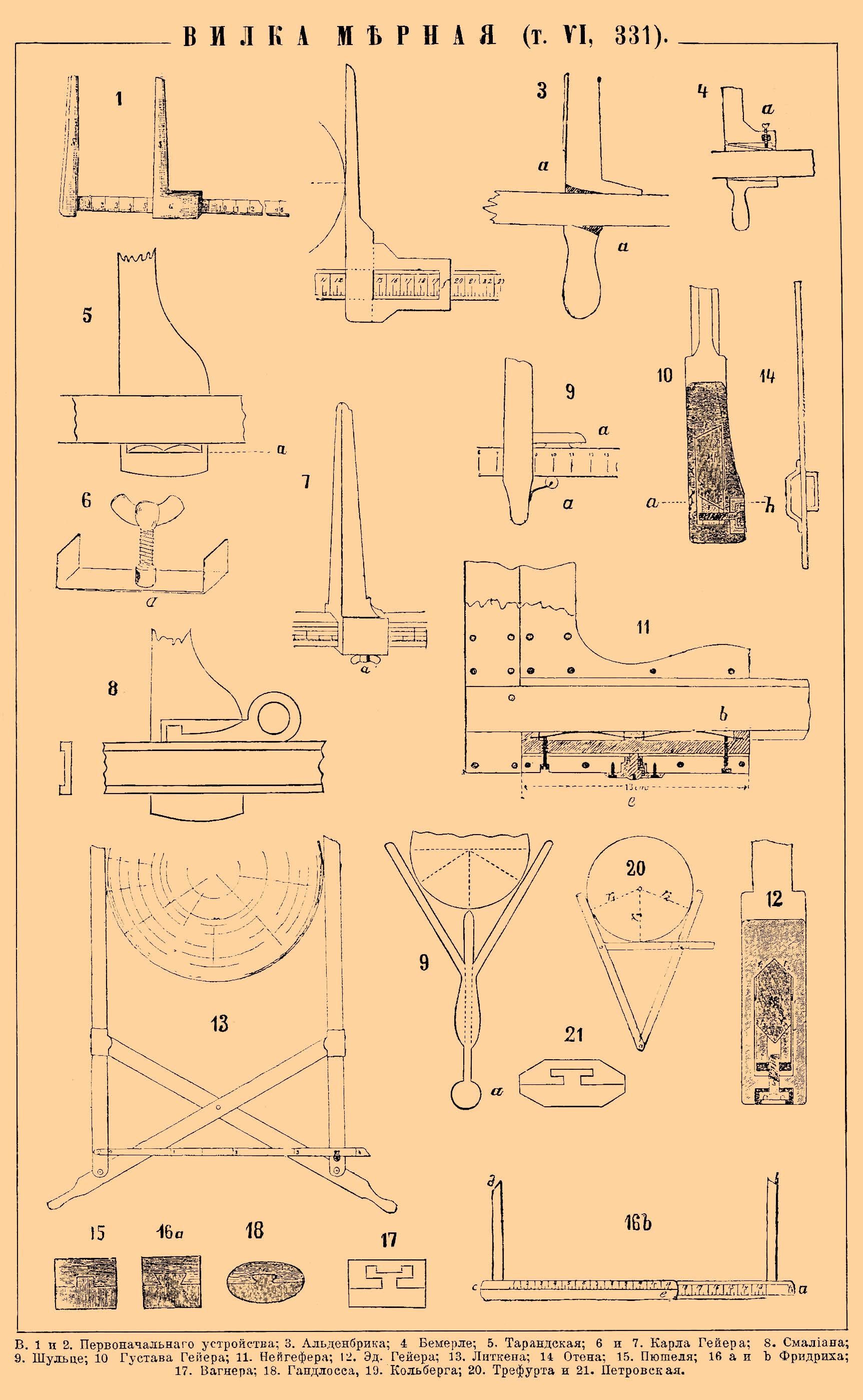 1) В. первой категории имеют шкалу различной формы. А) Шкала — прямоугольный параллелепипед. Сюда относятся: а) простейшие В. первоначального устройства, в которых параллельность подвижной ножки с неподвижной поддерживается расширением в 2—6 раз всего основания этой ножки, обхватывающего со всех сторон шкалу сплошь (фиг. 1), или с прорезами против надписи (фиг. 2), или же с расширением только одной части основания. Таковы старейшие по времени мерные В. Бургсдорфа (1780), Геннерта (1783), вюртембергская с надписями на шкале площадей кругов, соответствующих измеряемым диаметрам, а равно некоторые новейшие: Диттмара, Воборника, Штаудингера, Шабласса (складная, с деревянной шкалой и металлическими, опускающимися на шарнирах, ножками), вилка-посох Леонгарда Грубера и друг. б) Галицийская, Альденбрика (1864 г.), Фридриха (1876 г.) или И. П. Левитского (1876 г.), с косой вырезкой под углом 5—10° в подвижной ножке, в месте движения ее по шкале (фиг. 3 a), и такая же В., улучшенная Бемерле, с пружиной (фиг. 4 a), которая посредством винта может быть приближена или удалена от шкалы. в) Складная В. Оттена — с металлической рамкой, прикрепленной с одной стороны подвижной ножки и заменяющей собой обыкновенную в ней втулку, существующую во всех других В., а равно с особыми металлическими ручками для держания В. г) Тарандская, или Пресслера, с медной пружиной при основании подвижной ножки, впирающейся в узкую грань шкалы, покрытую тоже медной полоской (фиг. 5 a). д) Карла Гейера — с изогнутой металлическою пластинкой, приводимой в движение винтом (фиг. 6 и 7). е) Шварцвальдская, или Барта — с винтом. ж) Смалиана с клином (фиг. 8). з) Шульце — с колесками или вращающимися валиками (фиг. 9 a). Б) Шкала — параллелепипед с основанием трапеции (надпись цифр помещена на меньшей из параллельных граней): а) Рейссига — без особого приспособления; б) Лера — с клином, как в мерной В. Смалиана; в) Густава Гейера (механика Штаудингера) — с клином (фиг. 10 а) и винтом (б) и г) Нейгефера — с пружиной, клином и винтом. В) Шкала — плоская шестигранная призма: а) Гауманна, или мерная В.-револьвер — без всякого приспособления; б) Эдуарда Гейера — с винтом (фиг. 12 a) и двумя клиньями, упирающимися в две грани шкалы. Г) Шкала цилиндрической формы (механика Шабласса); у вилки как шкала, так и ножки состоят из медных, полых внутри цилиндрических трубок, легко разъединяющихся и укладывающихся в небольшой футляр при переноске.
