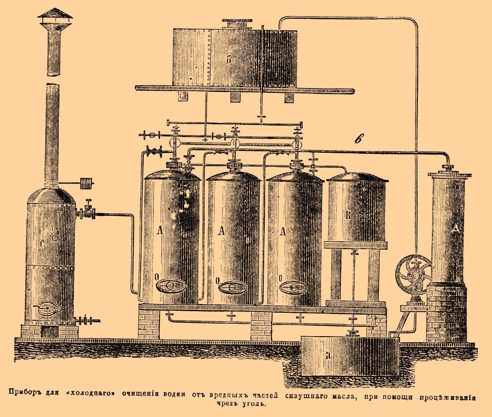 Гораздо более совершенное устройство водочных заводов, действующих "холодным" способом, состоит в применении особых фильтрационных аппаратов, каковы, напр., приготовляемые в Москве приборы Денгауера и Кейзера или Мюллера и Рочельзанга. Первый состоит из сортировочного чана а, резервуара б, 3-х фильтров А, А, А с углем и песочного фильтра В. В последнем имеется решетчатое дно, покрытое сукном, на которое накладывается слой мелкой пемзы, покрытой также сукном, и на последнее насыпается уже песок. Разбавленный водою спирт перекачивается насосом в резервуар б, откуда переходит в фильтры А, А, А. Система труб, соединяющих резервуар с фильтрами, устроена так, что по произволу можно сделать первый фильтр последним и обратно, а также выделять тот или другой фильтр из работы, напр., для паровой продувки угля, уже потерявшего поглощательную способность. Продувание паров ведется так, что пар из паровика С идет по трубе снизу в фильтр и увлекает оставшийся в угле спирт и уходит по особой трубке в в холодильник Д, где и сгущается в жидкость, стекающую в подставленную бочку. Выгребание угля из фильтров производится через отверстие внизу их О, О, О. Приготовленная таким образом водка содержит раствор спирта в воде (в определенной законом пропорции, т. е. 40° по объему первого) и подмесь небольшого количества альдегида, сивушного масла и т. п. веществ, бывших во взятом спирте [водка, очищенная "холодным" способом, никогда не бывает столь чиста, как полученная из вполне очищенного — ректификационною перегонкою — спирта. Только эта последняя при тщательном очищении заслуживает названия, специально присвоенного "очищенной" В. Способы испытания чистоты описаны в статье Винокурение, см. — Δ.].